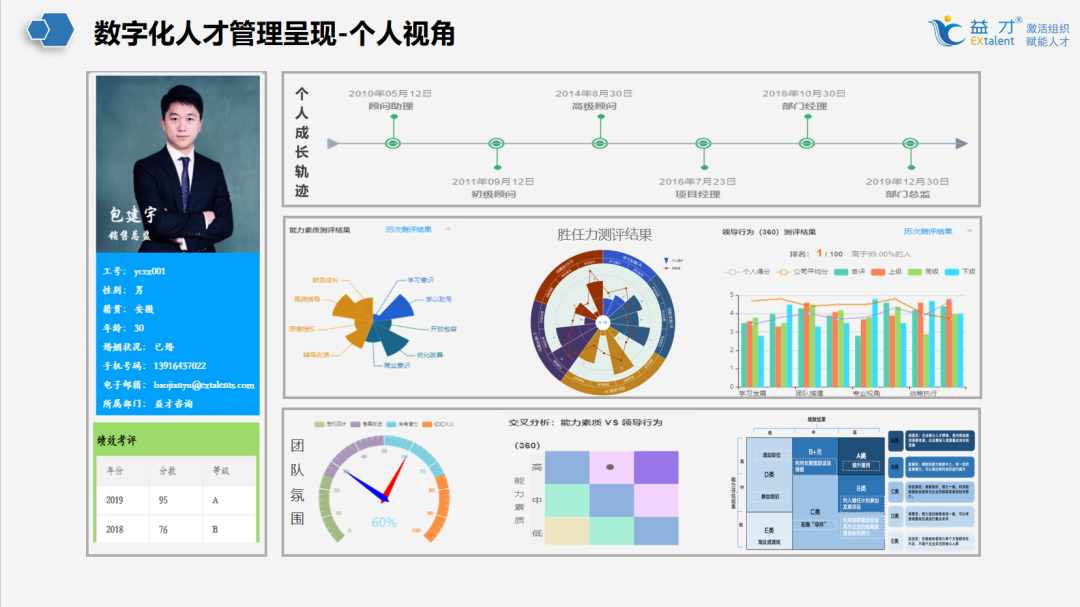 个人视角页面综合了员工的个人信息、人才发展轨迹、个人测评数据,以及交叉分析,形成人才画像。当企业想要迅速了解某个员工个体时,只需要将员工个人界面调出,就可以清晰的了解个人全方面的信息。