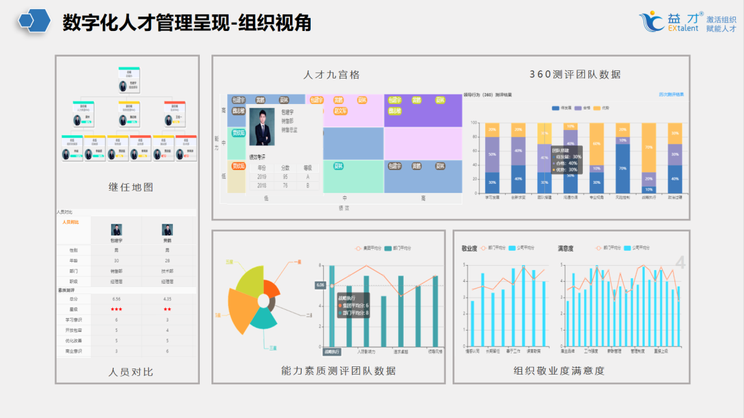 数字化人才管理更注重帮助企业快速分析诊断个人与组织,益才在整合并联了各个系统后,实现了可视化人才管理,并最终形成了个人可视化和组织可视化两种视角,支撑组织和个人前瞻性的做出决策,帮助企业快速的发展。