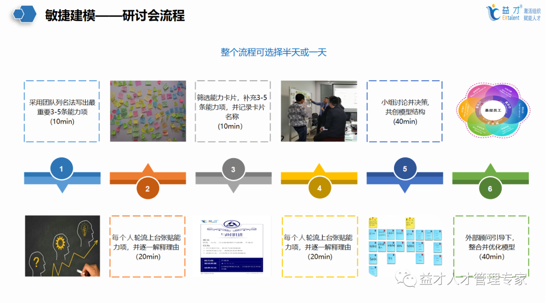 敏捷建模是通过敏捷建模工作坊的方式,依据特定的流程,借助卡片等工具,由公司管理层、业务部门、HR共同参与,能够敏捷、快速的建立关键岗位能力素质模型的一种方法。敏捷建模具有项目周期短,节奏灵活,企业内部深度参与,趣味性强,模型内部认可度高,模型构建精细程度中等,人力物力财力投入较少等特点。
