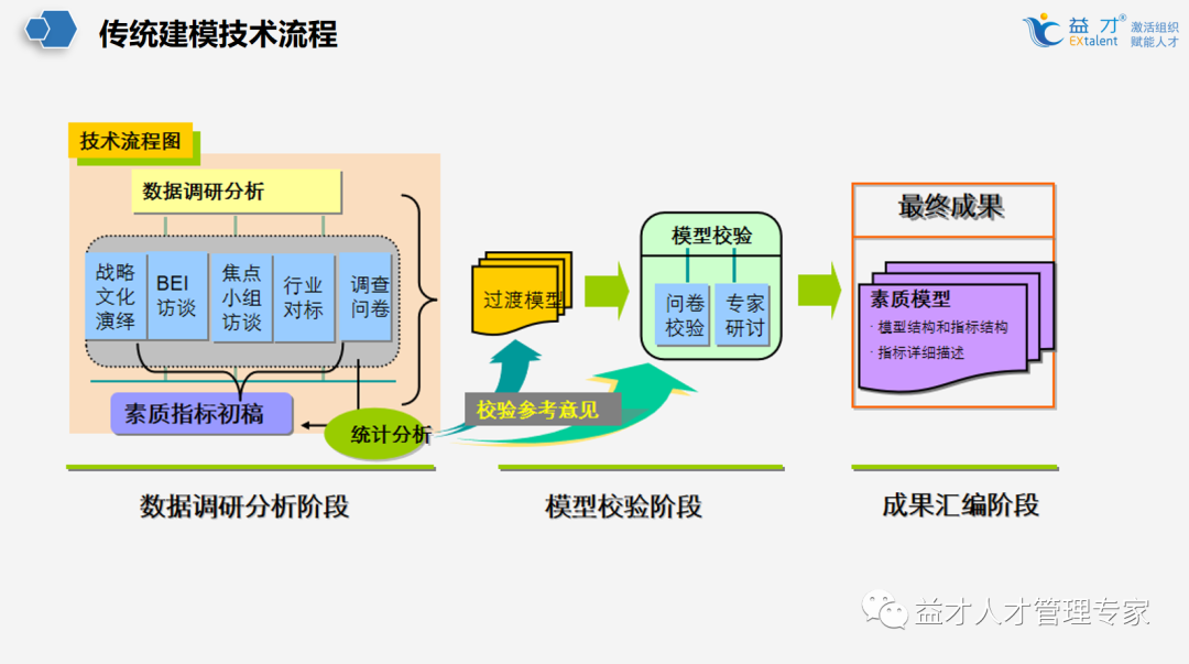 传统建模是包括战略文化演绎、问卷调查、专家访谈、焦点小组访谈、编码、企业对标等。传统建模具有项目周期长,节奏缓慢,企业内部参与度低,需要企业内部多次宣贯,构建模型精细程度相对较高,人力物力财力投入较多等特点。