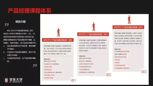 研发核心的工作流程为: 产品设计、用户体验、开发、算法、大数据、测试/质量控制,。在下面,是我们项目管理的敏捷价值交付;在上面,是我们的信息安全;在两头,一头是我们的新员工,另外一头是我们的管理者。通过这个整体业务场景的分享,我们定义了六大“岗位簇”做为横向坐标(后续随着业务发展增加至11个序列),纵向是基于“岗位簇”的能力层级,综合起来就是我们的课程体系。以下,是我们以产品经理为例介绍课程体系的设计。