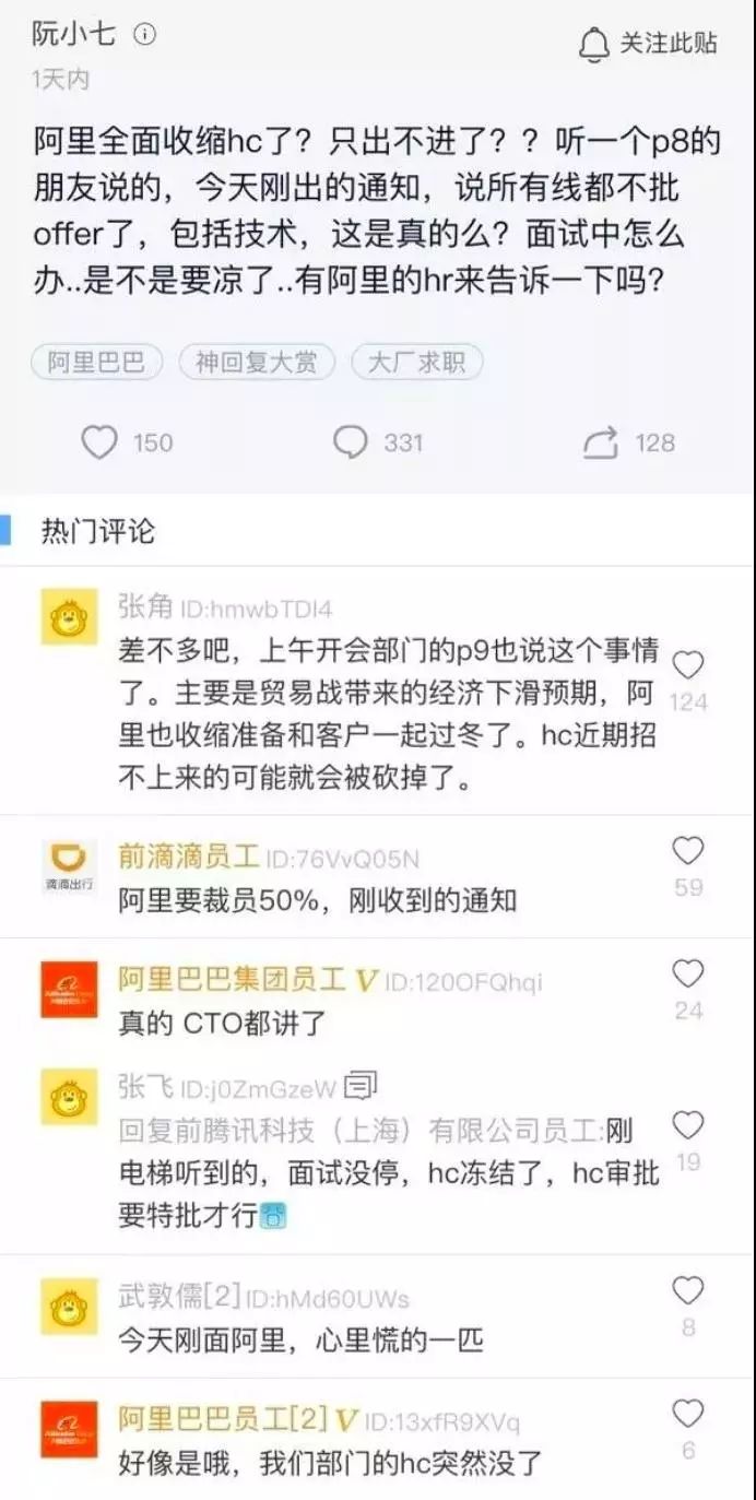 该留言得到了部分网友的回应,还有认证是前滴滴员工的在回复中称阿里要裁员50%,刚收到的通知,并有不少网友附和声称是真的。