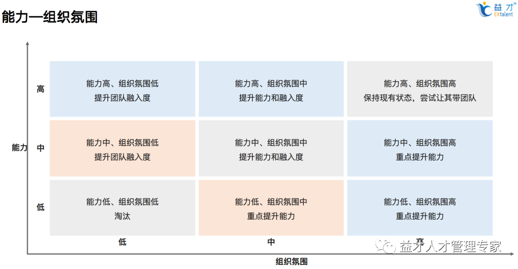 能力—组织氛围九宫格通常能反映出一个团队的氛围以及团队领导者的管理风格,基于不同的盘点结果,采取不同的管理行为。