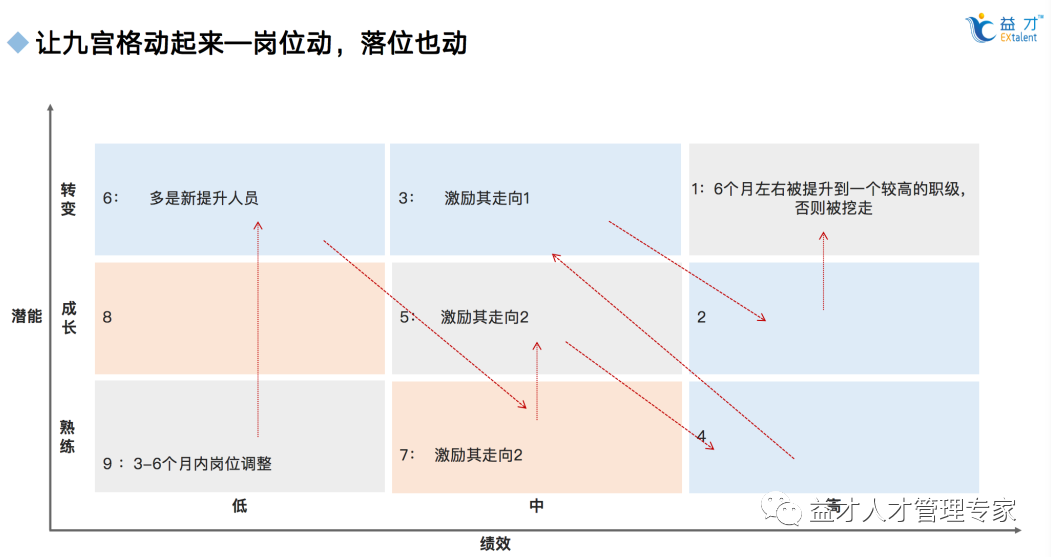 第二种动态九宫格:岗位动,落位也动。岗位发生变化时,人才落位也发生变化时,应基于人才落位的变化,给与不同的措施。如下图: