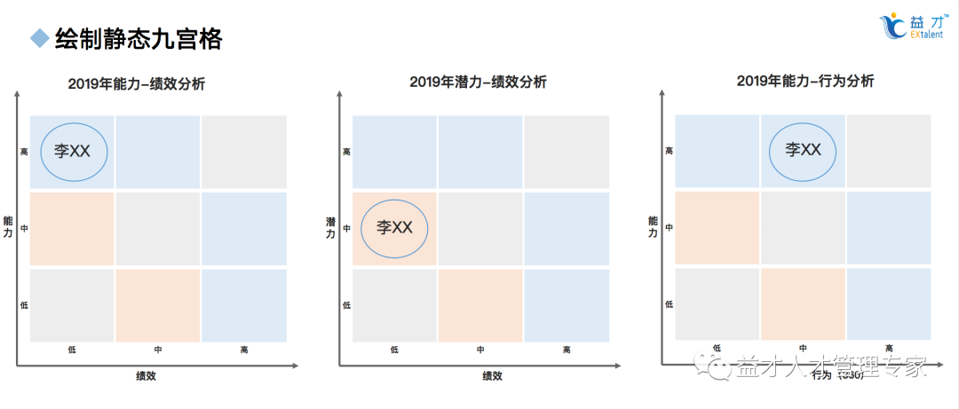 如:李XX在三个九宫格的落位是不一样的,综合看来,李XX的能力较强,但可能由于初来公司还处在适应阶段,并没有表现出较高的绩效,但他有一定的工作潜力(潜力-绩效分析)和较高的工作积极性(能力-行为分析),因此可以采取培训或辅导的形式,帮助其提升绩效。