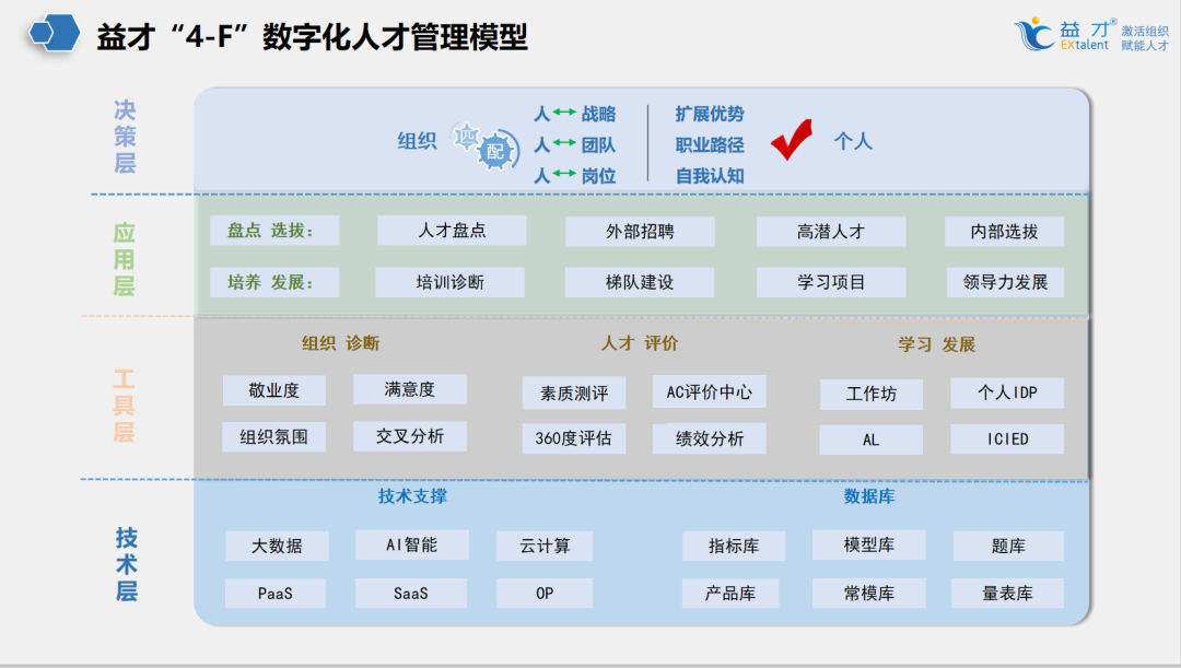 益才在构建“4-F”数字化人才管理模型的过程中,通过底层技术层的数据支持,到转化成可利用的工具层,到解决企业实际工作痛点、难点的应用层,最终帮助企业依靠数字化人才管理做出有效决策,支撑公司战略、人才战略的有效落地,从而实现个人与岗位、个人与团队、个人与组织的最佳匹配。