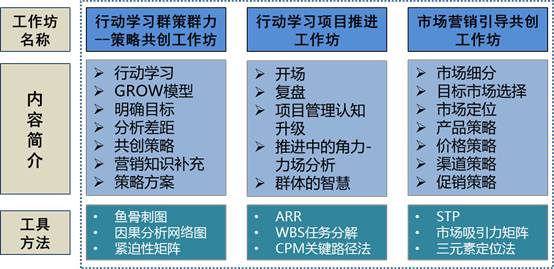 第一类是行动学习工作坊。行动学习工作坊贯穿整个项目,从议题聚焦、策略共创、绩效推进到总结评估,每个阶段都会安排行动学习工作坊,它是整个项目的主线。