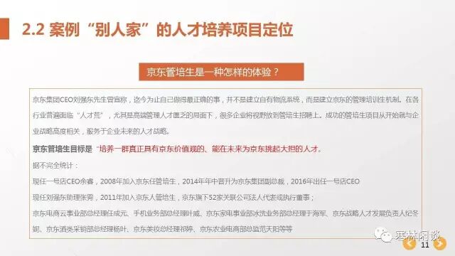 小结:从京东的管培生案例可以看出,管培生项目实行成功与否与高管层的支持和业务部门的把关密不可分,高管层的积极响应、影响力对管培生的高关注度是项目运行的一针“强心剂”决定着管培项目成功的核心关键,当然,还需要思考的是像刘强东如此重量级的企业家都如此用心去培养人才,为啥多数企业做不到了?